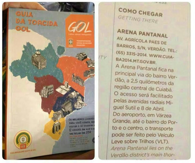 Sem nem 50% do projeto concluído, o Veículo Leve sobre Trilhos (VLT) da Grande Cuiabá figura no “Guia da Torcida Gol”, distribuído pela Gol Linhas Aéreas, como meio alternativo de transporte para os turistas que desembarcarem no Aeroporto Marechal Rondon e que queiram ter acesso à Arena Pantanal, no Verdão.