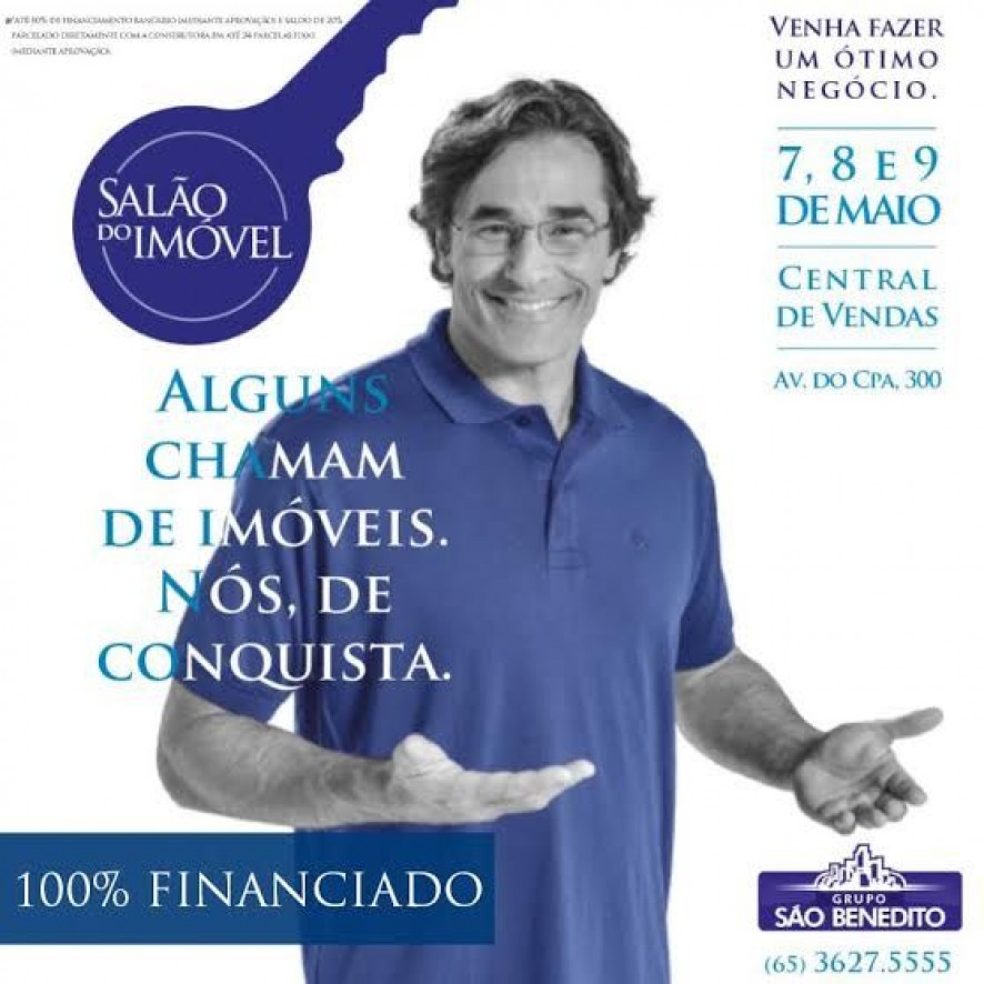 E o melhor 100 % financiado, é a maior facilidade de negociação que você já viu. Não perca, dias 7,8 e 9 de maio na central de vendas do grupo São Benedito, na avenida do CPA, informações 3627 – 5555