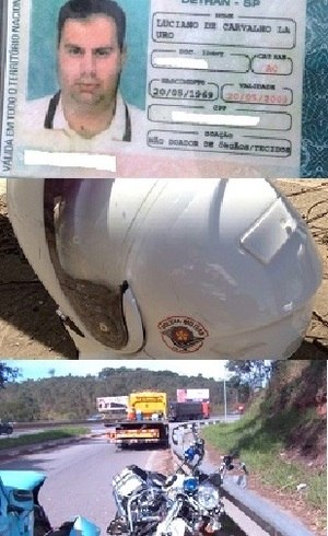 Carteira de habilitação vencida de Luciano de Carvalho Lauro, capacete da PM e moto envolvida em acidenteReprodução