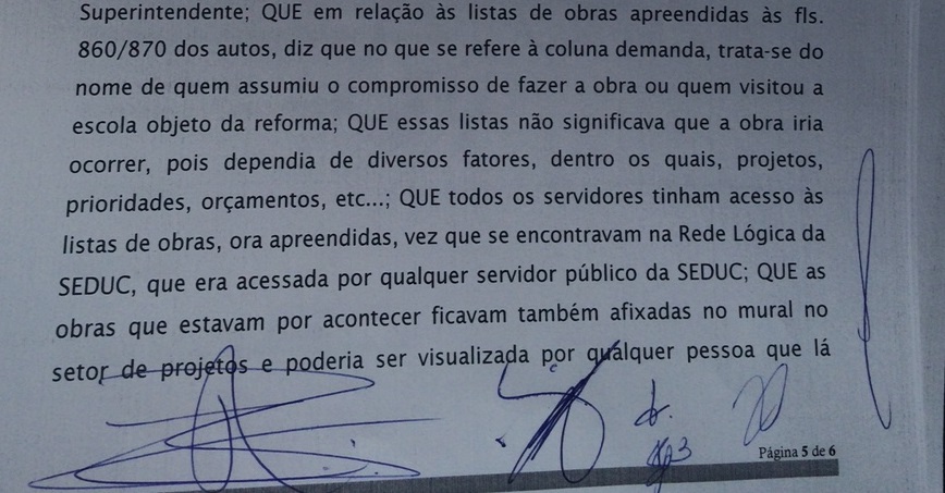 “Todos os servidores tinham acesso às listas de obras, ora apreendidas, vez que se encontravam na Rede Lógica da Seduc, que era acessada por qualquer servidor público da Seduc. Que as obras que estavam a acontecer ficavam também afixadas no mural no setor de projetos e poderia ser visualizada por qualquer pessoa que lá tivesse acesso”, afirmou.