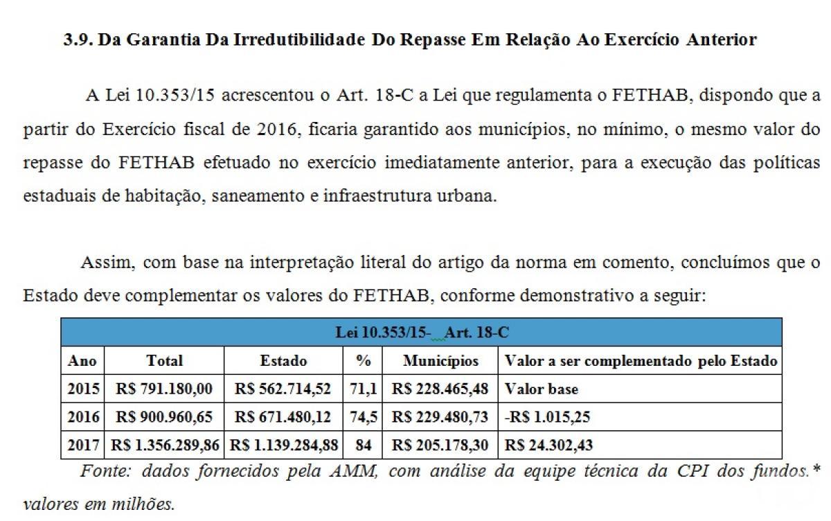 Segundo dados fornecidos pela própria AMM ao corpo técnico da CPI dos Fundos, os repasses do Fethab, entre os anos de 2015 a 2017, respectivamente, foram de R$ 228,465 mil, R$ 229,480 milhões e R$ 205,178 milhões. Confira trecho do relatório da CPI: