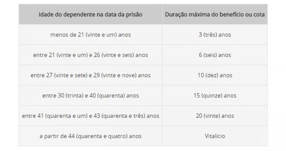 Caso a prisão aconteça depois das 18 contribuições, o tempo de duração do benefício varia de acordo com a tabela abaixo.