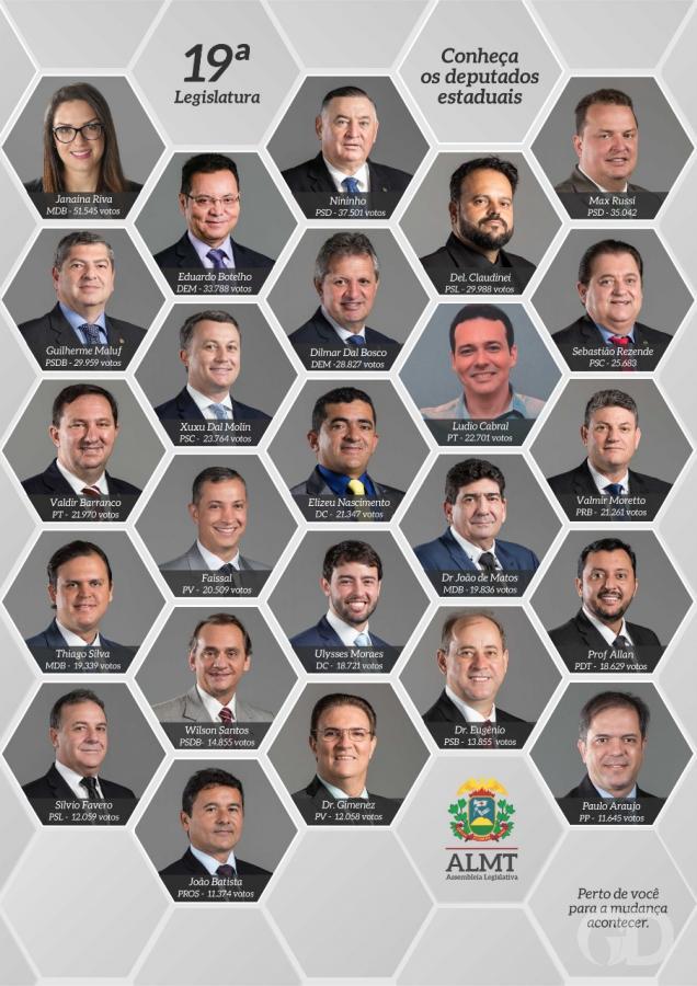 Quatro são os deputados naturais da capital mato-grossense: Ulysses Moraes (DC), Professor Allan Kardec (PDT) , Paulo Araújo (PP) e Guilherme Maluf (PSDB). Do interior, Janaina Riva (PSDB) é natural de Juara, Eduardo Botelho é de Nossa Senhora do Livramento, Elizeu Nascimento é de Tangará da Serra e Thiago Silva é de Rondonópolis (MDB).
