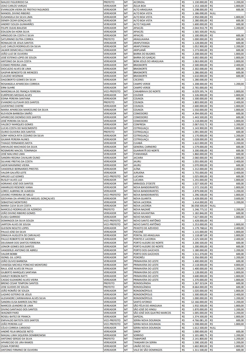 Há ainda o candidato à Prefeitura de Rondolândia, José Guedes de Souza, o Guedes (MDB), que declarou ter R$ 8,6 milhões em bens e recebeu R$ 600 de auxilio emergencial. Também candidato no município, Breno Temponi Santos (PT), declarou R$ 1,2 milhão.