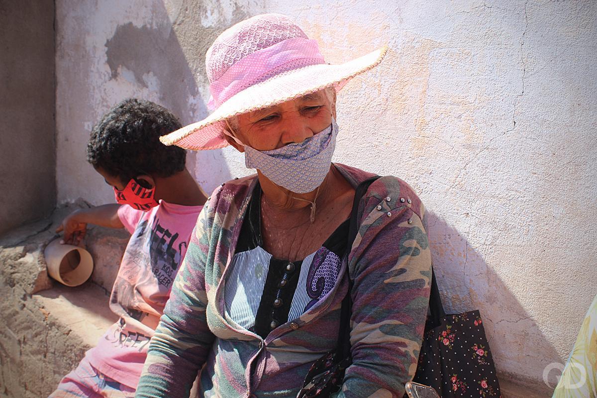 Maria Eduarda da Silva, 69, mora em um sítio na área rural de Cuiabá. Ela estava acompanhada do neto, Isaque, 5, para pegar doações. Desde quando a criança era bem pequena, ela busca as doações para alimentar a família.