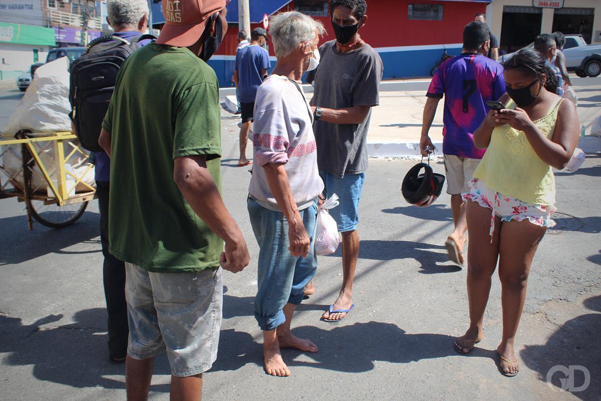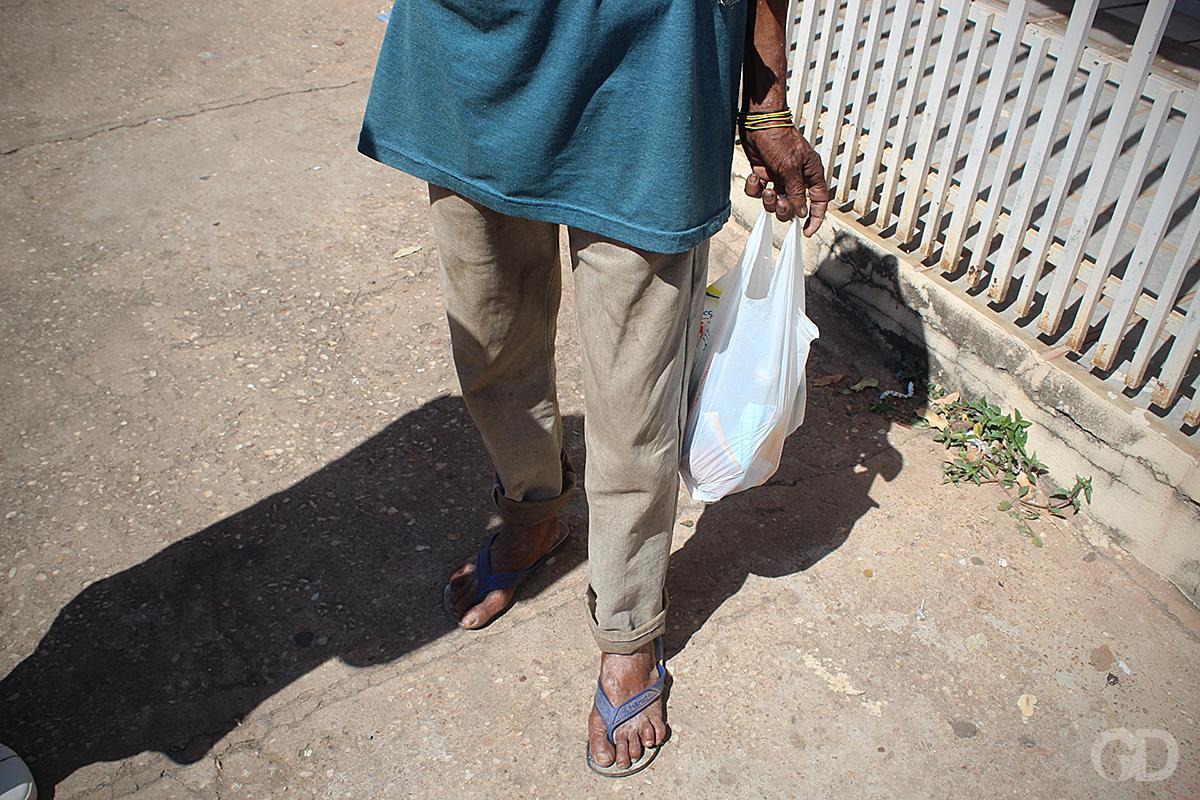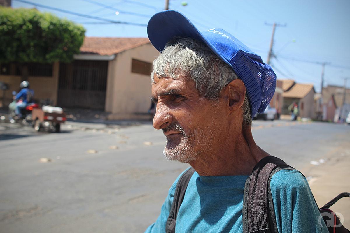 “Eu faço com maxixe, com chuchu, faço uma meleca lá e fica bom demais. Dá para dois dias. É pouco, mas é um pouco de Deus que dá de bom coração”, conta o idoso, que mora sozinho. “Eu vivo por aí vegetando pelo mundo”, conta o idoso descalço no asfalto quente de Cuiabá. O chinelo arrebentou e ele não tinha dinheiro para comprar um novo. Desempregado, ele faz bicos para sobreviver, visto que ainda não se aposentou.