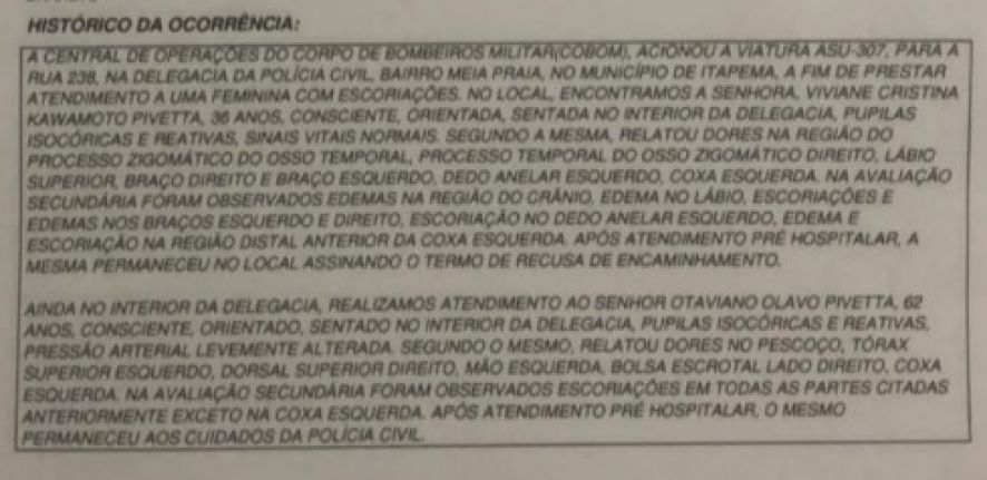 Uma certidão de ocorrência do Corpo de Bombeiros constatou que tanto a advogada Viviane Cristina Kawamoto, quanto o seu ex-marido, o vice-governador Otaviano Pivetta, sofreram lesões na briga que tiveram em Santa Catarina.