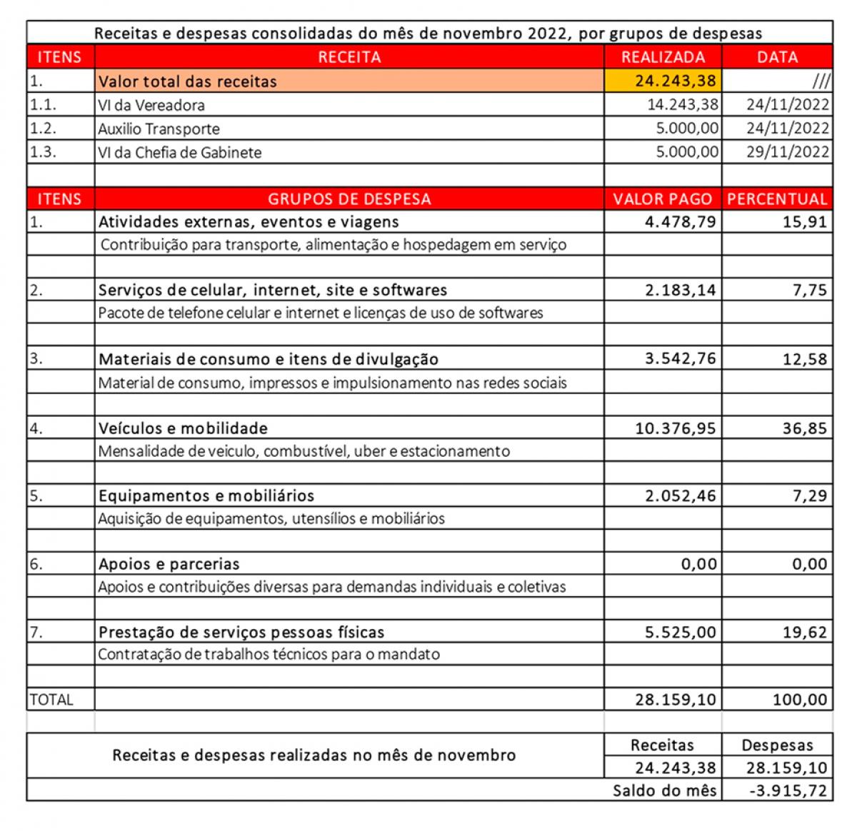 Ela apresentou sua prestação de contas referente ao mês de novembro de 2022, onde aponta que as verbas indenizatórias dela, da chefe de gabinete e o auxílio-transporte são depositados na conta em questão. (Ver no final).