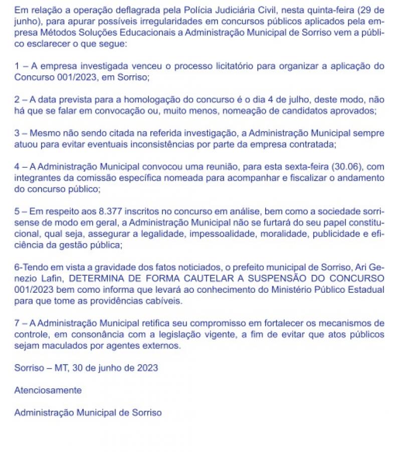 Por meio de nota, a prefeitura informou ter convocado uma reunião com a comissão responsável pelo concurso para tratar do assunto nesta sexta-feira (30). “Tendo em vista a gravidade dos fatos noticiados, o prefeito municipaldeSorriso, AriGenezioLafin, determina deforma cautelara suspensão do concurso 001/2023 bem como informa que levarão conhecimento do Ministério Público Estadual para que tome as providências cabíveis”, disse.