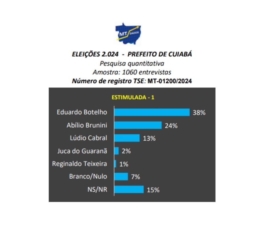 Botelho lidera pesquisa com 38%; Abílio tem 24% e Lúdio 13% A pesquisa do instituto MT Dados foi realizada entre os dias 28 e 31 de maio e teve 1.060 entrevistas