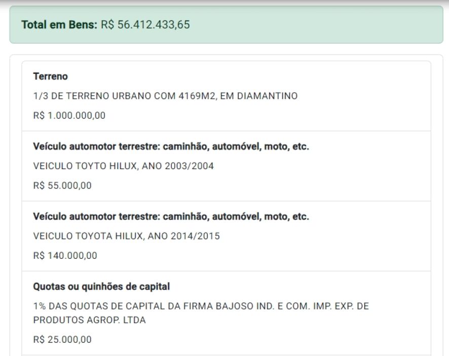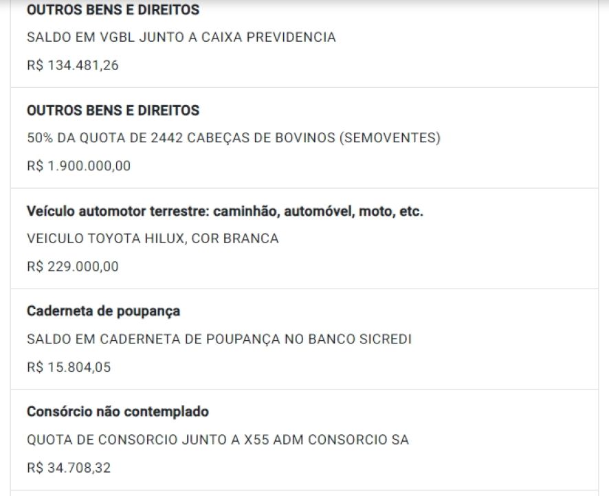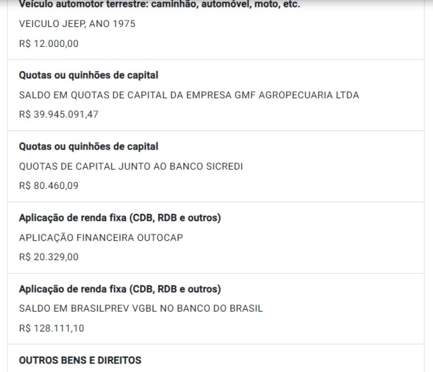 O valor mais expressivo da fortuna do candidato vem do saldo em quotas de capital da empresa GMF Agropecuária LTDA, equivalente a R$ 39.945.091.