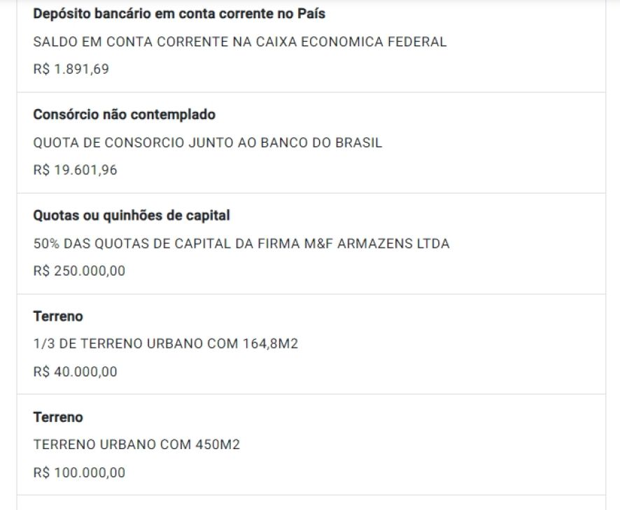 De imóveis, o candidato listou um apartamento de R$ 600 mil, uma casa de alvenaria no mesmo valor e três terrenos, que ao todo somam mais de R$ 1,4 milhão.