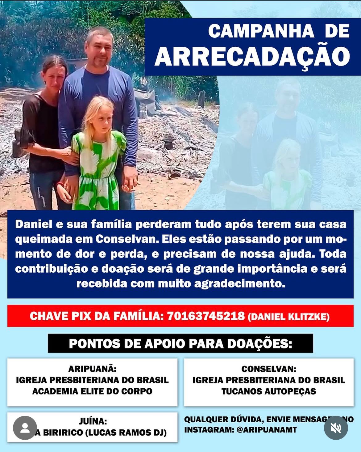 Além da investigação policial, uma campanha de arrecadação foi organizada para ajudar a família a reconstruir a casa. As doações podem ser feitas por meio da chave Pix 70163745218 (Daniel Klitzke) ou nos pontos de apoio em Aripuanã, Conselvan e Juína.