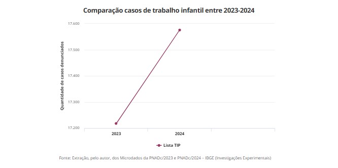 Em 2023, foram contabilizados 45.502 casos de crianças e adolescentes entre 5 e 17 anos em situação de trabalho infantil. Desse total, 17.218 estavam submetidos a atividades incluídas na Lista TIP, que reúne as piores formas de trabalho infantil.