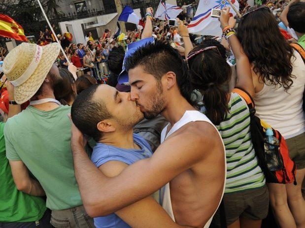 A polícia impediu nesta quinta-feira a manifestação de uma centena de homossexuais, homens e mulheres, que convocaram um "beijaço" durante a passagem do papa Bento XVI, bloqueando o grupo quando ele se dirigia ao local previsto para sua ação. Apesar disso, ao menos dois rapazes foram fotografados se beijando durante a passagem do Pontífice pela Praça Cibeles.