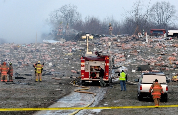 Bombeiros nos escombros de casa que explodiu nesta quarta-feira (2) em Suffield, no estado americano de Ohio. Regina Proudfoot, de 63 anos, e o neto Robert Croft, de 21, morreram no acidente, durante a madrugada. Testemunhas disseram que a explosão foi ouvida a quilômetros, e que destroços voaram pelo bairro. Uma explosão de um tanque de propano poderia ter causado o acidente, mas uma investigação vai ser feita.