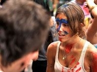 Caloura da Faculdade de Medicina do ABC recebe tinta no rosto durante trote solidário em creche (Foto: Divulgação)