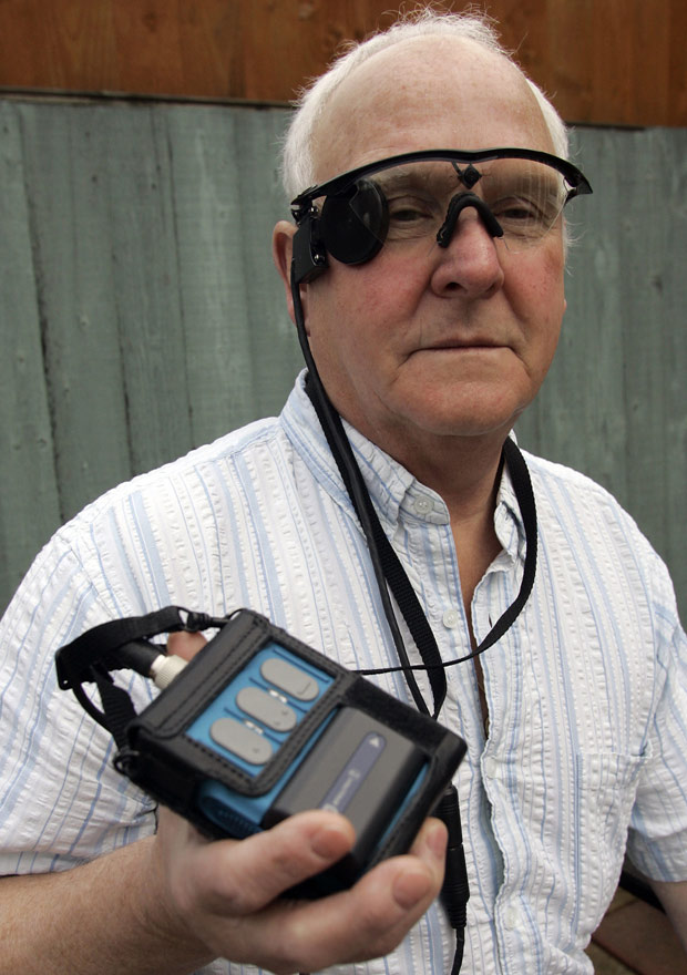Retina artificial está ligada ao aparelho. Eric Selby, de 68 anos, foi cego durante duas décadas.