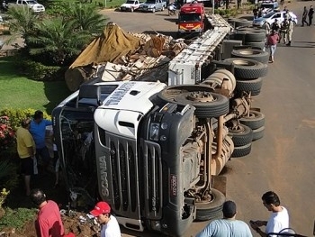 Uma carreta Scania, branca, modelo G-420, placas de União da Vitória (PR), tombou, nesta manhã, na BR-163, em uma rotatória que faz ligação com a avenida dos Tarumãs, próximo a uma distribuidora de bebida. Ela estava carregada com lâminas (derivados de madeira), que seriam descarregadas em Sinop.