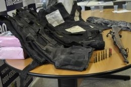 Foram encontrados um mosquetão calibre 7 mm de uso restrito e em boas condições de uso, sete cartuchos calibre 7mm, quatro coletes e proteção balística de cor preta, três blusões camuflados, dois jogos de placas, uma calça preta e um cartucho de calibre 12.