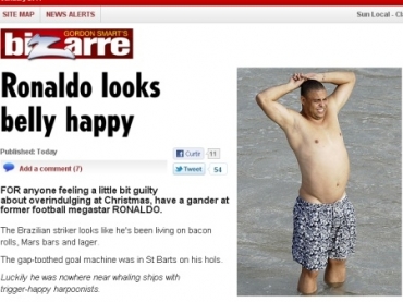 Nesta terça-feira (4), o diário afirmou que quem se sente culpado por ter comido demais no Natal deve olhar para a barriga de Ronaldo. Para completar, o The Sun escreveu que o atacante parece viver à base de bacon.