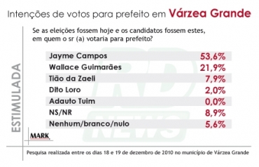A Mark ouviu 302 eleitores entre 18 e 19 deste mês. A margem de erro é de 3% para mais ou para menos. Na simulação com os nomes de Jayme, do deputado estadual reeleito Wallace Guimarães (ex-DEM e hoje no PMDB), do vice-prefeito Tião da Zaeli (PR), do ex-vereador e secretário do prefeito Murilo Domingos, Dito Loro (sem partido), e do empresário Adauton Tuim, presidente da Associação Comercial e Industrial, o senador impõe mais de 30 pontos percentuais de frente do segundo colocado, Wallace, que figura com 21,9%.