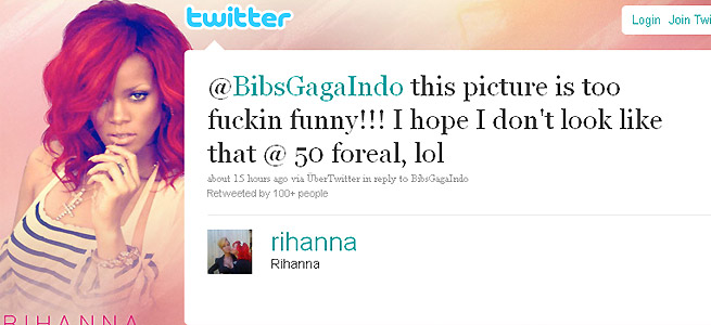 As duas aparecem com o mesmo tom de cabelo nas fotos. "Essa foto é muito engraçada!Espero não estar assim com 50 de verdade", respondeu Rihanna em seu perfil no microblog. Ela está com os cabelos vermelhos desde junho, quando apareceu com o novo visual durante um show na Espanha.
