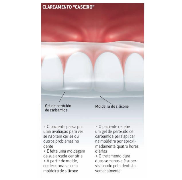 O dentista prescreve certa quantidade de gel com peróxido clareador e a pessoa o aplica na moldeira, usada quatro horas diárias por mais ou menos duas semanas.