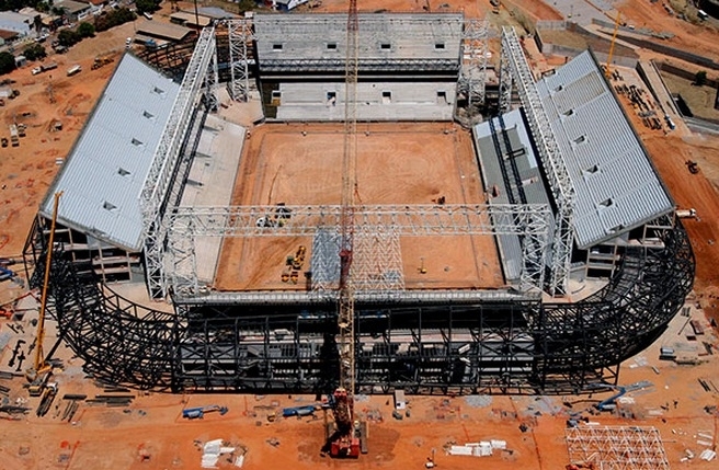 A primeira parte da estrutura metálica que compõe a cobertura das arquibancadas foi instalada nesta quarta-feira, no setor Norte da Arena Pantanal. Após a pré-montagem em solo, a armação de aproximadamente 83 toneladas foi içada por um guindaste, localizado na área externa do estádio. A armação que cobrirá por completo os torcedores desse setor pesa 250 toneladas.