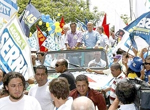 Terminou com um longo abraço de José Serra em Aécio Neves a carreata que o PSDB de Minas Gerais organizou na zona sul de Belo Horizonte para o candidato tucano a presidente, neste sábado. Aécio retribuiu com um beijo em Serra.