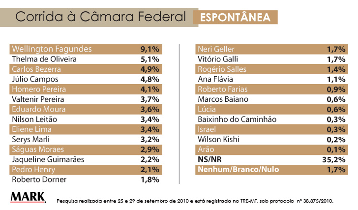 Vários candidatos pontuam com menos de 2% na espontânea, como o empresário Roberto Dorner, do PP, que detém 1,8%; os suplentes de deputado Neri Geller (PP) e Vitório Galli (PMDB), ambos com 1,7%; o ex-governador tucano Rogério Salles (1,4%), a comunista Ana Flávia (1,1%), o empresário de Barra do Garças Roberto Farias (PP), que está com 0,9%; e Marcos Baiano (PTB), que aparece com 0,6%. O percentual dos que disseram não ter escolhido nome para federal, mesmo com o fim da campanha, é considerável. Chega a 35,2%. Votaria em branco ou anularia o voto 1,7%.