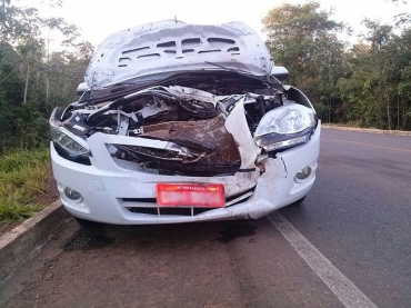Um acidente foi registrado, esta manhã, na MT-242. Um táxi GM Prisma branco, que seguia sentido Nova Ubiratã-Sorriso, acabou colidindo com uma anta, que atravessava a pista. Quatro pessoas estavam no veículo e duas ficaram levemente feridas. O animal morreu. A parte frontal do veículo ficou bastante danificada. O prejuízo está sendo levantado.