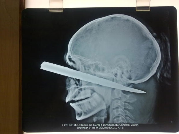 Raio X mostra o rosto de Bhuvaneswar Kumar, de 30 anos, que sobreviveu após ter sido perfurado por uma barra de metal. A foto foi tirada no hospital AIIMS, em Nova Déli, em 9 de setembro. Ele foi atingido depois de cair da bicicleta. A barra estava cravada no chão, e atingiu Kumar entre os olhos.