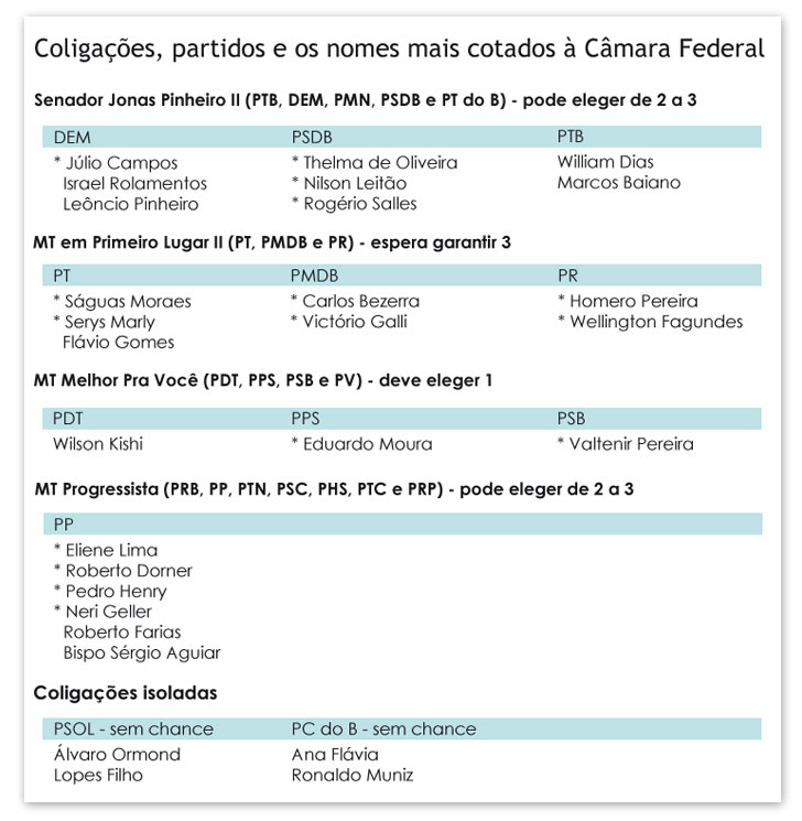Com base em resultado de pesquisas, consulta aos partidos e seus dirigentes, logística e estratégia montadas, é possível declinar nomes dos possíveis eleitores e/ou reeleitos por partido e/ou coligação. A tríplice-aliança PSDB-DEM-PTB, que sustenta a candidatura do tucano Wilson Santos a governador, espera eleger entre dois e três, considerando o quociente eleitoral de 200 mil votos. O mais cotado é Júlio Campos, enquanto Thelma de Oliveira briga com Nilson Leitão por uma vaga. Rogério Salles corre por fora. Os demais da coligação não demonstram chances, nem mesmo o empresário Israel Rolamentos, empurrado pelo missionário Valdemiro Santiago, da Igreja Mundial do Poder de Deus, assim como Lêoncio Pinheiro e os petebistas William Dias e Marcos Baiano.