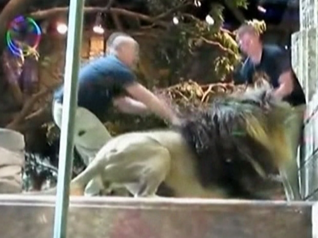 O leão parecia estar relaxando quando, de repente, parte para cima de um dos tratadores.