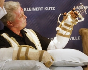 O quiroprático Richard Edwards mexe os dedos durante coletiva de imprensa no Hospital Judeu em Louisville, nos Estados Unidos. Com 55 anos de idade, ele sofreu queimaduras graves em ambas as mãos em 2006 e passou por uma cirurgia para transplantar os órgãos. O norte-americano é o terceiro a receber novos membros, simultaneamente, no país.