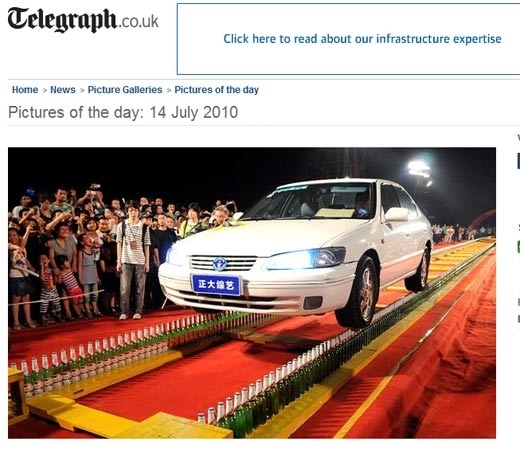 O chinês Li Guiwen estabeleceu um novo recorde e entrou para o Guinness ao dirigir um veículo sobre duas fileiras de garrafas de cerveja por 60,19 metros em Wenzhou, na província de Zhejiang. Ele levou 8 minutos e 28 segundos para completar o percurso. As duas fileiras contavam com total de 1.798 garrafas de cerveja, segundo reportagem do jornal inglês "Daily Telegraph".