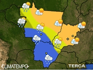 Nesta terça-feira, uma frente fria provoca chuva a qualquer hora do dia e queda na temperatura no sul de Mato Grosso. No centro-leste de Mato Grosso, o sol aparece com força e o ar seco inibe a formação de nuvens carregadas e com isso, não chove. Nas demais áreas do Estado, o sol aparece e chove a partir da tarde.