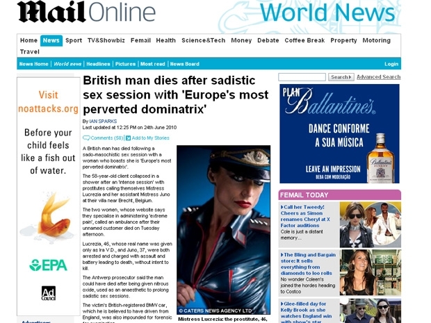 Um homem britânico de 58 anos morreu após uma sessão de sexo sadomasoquista em um pequena cidade do interior da Bélica, realizada por uma mulher que se autointitula a "dominadora mais pervertida da Europa". De acordo com informações do site Mail Online, "Mistress Lucrezia", 46, apelido da prostituta, e sua assistente, "Mistress Juno", 37, chamaram uma ambulância na tarde da última terça-feira (22) para a casa onde as sessões eram realizadas, no vilarejo de Sint-Job-in-"t-Goor, próximo a Brecht, e o cliente foi encontrado morto debaixo de um chuveiro.