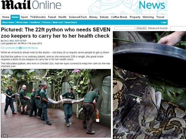 Uma cobra de seis metros de comprimento foi carregada para sua consulta no veterinário por sete pessoas. Bali, do zoológico de Chester, no Reino Unido, fez uma visita ao especialista para checar sua saúde. Ela se alimenta de pequenos mamíferos e pássaros.