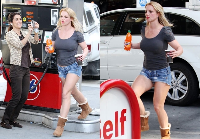 Brintey Spears movimentou um posto de Los Angeles. Durante uma pausa para comprar algumas bebidas, a cantora foi flagrada usando shorts jeans curtíssimo que exibia suas pernas e sem sutiã. A princesinha do pop esteve no local na sexta-feira (19) e acabou sendo alvo das lentes dos paparazzi e de fãs.
