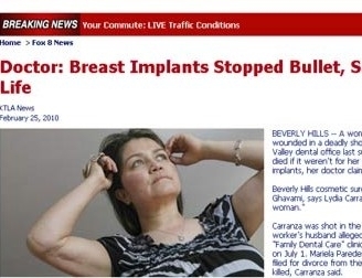 Uma americana de Beverly Hills, no estado da Califórnia (EUA), foi salva da morte por causa de seu implante de silicone nos seios.