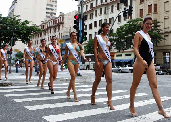 Candidatas ao Miss Brasil Turismo desfilaram de biquíni no Largo do Arouche, no Centro de São Paulo, neste sábado (20) em um ensaio que chamou a atenção de pedestres e motoristas que passavam no local (Foto: Michel Filho/Agência O Globo )