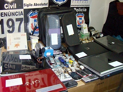 Seis adolescentes, com idades entre 14 e 16 anos, foram detidos, ontem à noite, acusados por uma série de furtos que estavam sendo registrados no município, nas últimas semanas. Com eles, policiais apreenderam 5 notebooks, 4 filmadoras, 5 máquinas digitais, 12 celulares, 12 relógios, 55 chips de celulares, modem de acesso à internet, 1 playstation, 24 carrinhos miniatura de coleção, dois porta CDs e duas mochilas. Parte do material já foi identificado como de duas lojas de eletrodomésticos e eletroeletrônicos, bem como de residências arrombadas recentemente.