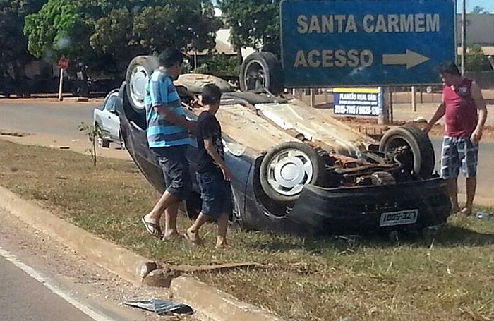 Um VW Gol, azul, acabou tombando, neste sábado à tarde, na BR-163, no trevo de acesso a Santa Carmem. O carro ficou sobre o canteiro que "divide" a rodovia e a rua João Pedro Moreira de Carvalho.