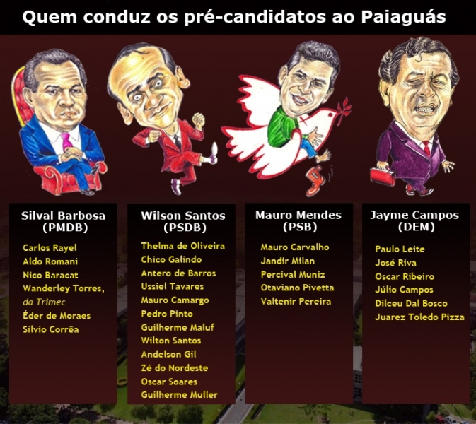 O pré-candidato tucano Wilson Santos está disposto a renunciar ao mandato de prefeito até 3 de abril para disputar à sucessão de Maggi. Seus principais auxiliares são o ex-senador Antero de Barros, o procurador-geral do Município Ussiel Tavares, os jornalistas e ex-secretários de Estado de Comunicação Mauro Camargo e Pedro Pinto, o deputado estadual Guilherme Maluf, além da presidente da legenda tucana Thelma de Oliveira. Também compõem o quadro de assessores de campanha o irmão de Wilson, Wilton Santos, ex-prefeito de Novo Airão (AM), os ex-secretários Zé do Nordeste (Finanças), Andelson Gil do Amaral (Infraestrutura) e Oscar Soares (Trânsito e Transporte Urbano), assim como o vice-prefeito Chico Galindo (PTB) e o secretário de Finanças de Cuiabá Guilherme Muller.