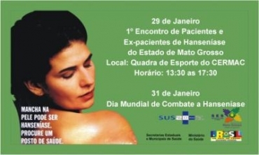 Será realizado no dia 29 de Janeiro, o 1º Encontro de Pacientes e Ex-pacientes de Hanseníase de Mato Grosso. E no dia 31 de Janeiro, a exemplo do que aconteceu na 55ª Semana, no ano passado, serão feitas alusões aos cuidados com a Hanseníase em todas as Missas celebradas em Igrejas Católicas de Cuiabá.