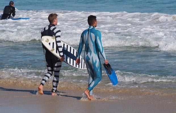 O modelo "Ellude" permite camuflar os surfistas na água, enquanto o "Diverter", com padrões de raias brancas e azuis, pretende simular os sinais naturais que repelem os tubarões, segundo a agência local "AAP".