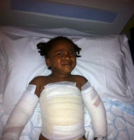 Criança sofreu queimaduras no rosto, peito, braços e mãos.