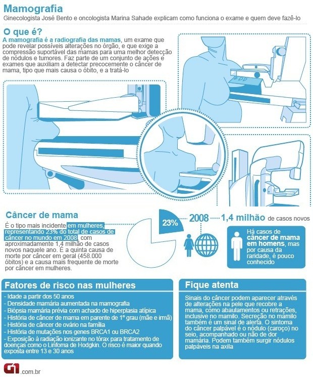 Esse exame consegue detectar tumores pequenos que o autoexame não consegue. Por isso, o autoexame não funciona para diagnosticar a doença, apenas faz a mulher conhecer os próprios seios, como alertou o ginecologista José Bento. Caso ela encontre um carocinho, isso não necessariamente indica que é um câncer - segundo a mastologista Maira Caleffi, a cada dez nódulos, apenas um é câncer.